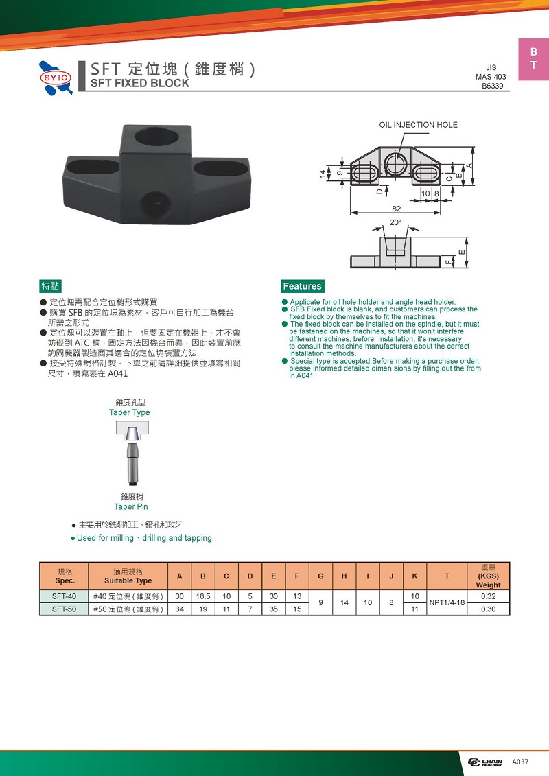 1.定位塊需要配合定位銷形式購買,其分兩種:直柄和錐柄 2.購買SFB-1的定位塊為素材,客戶可自行加工為機臺所需之形式; 3.定位塊可以裝置在軸上,但要固定在機器上,才不會妨礙到ATC壁,