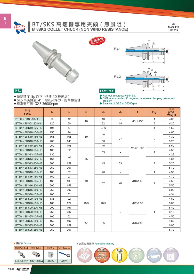 ● SKS筒夾錐度:4°,增加加持力、提高穩(wěn)定性。