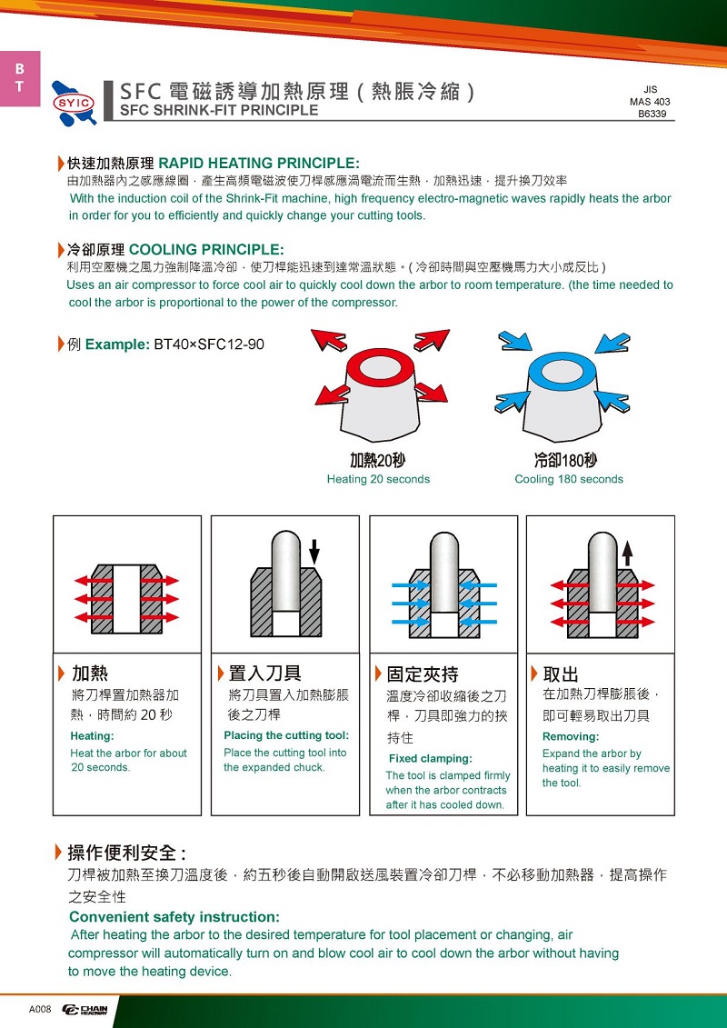 2. 冷卻方式:刀桿被加熱至換刀溫度后,約5秒后可自動開啟送風(fēng)裝置冷卻刀桿,不必移動加熱器,提高操作之安全性;