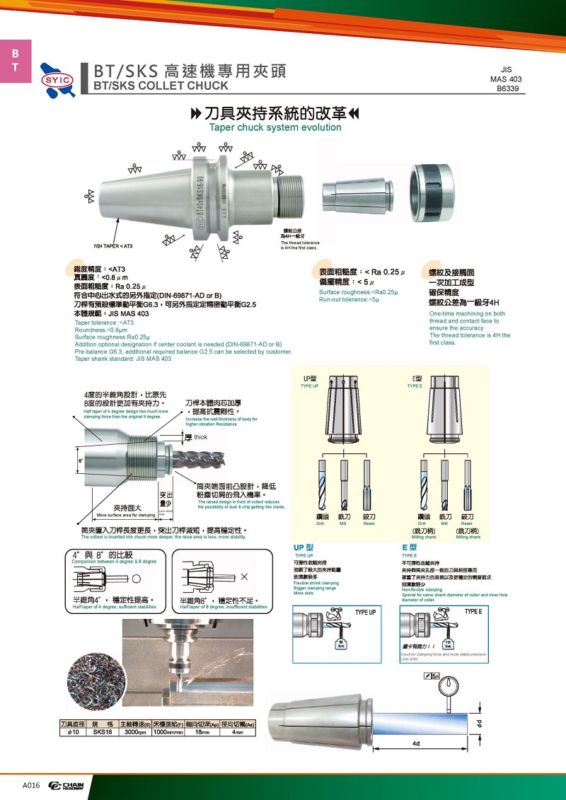 ● SKS筒夾錐度:4°,增加加持力、提高穩(wěn)定性。