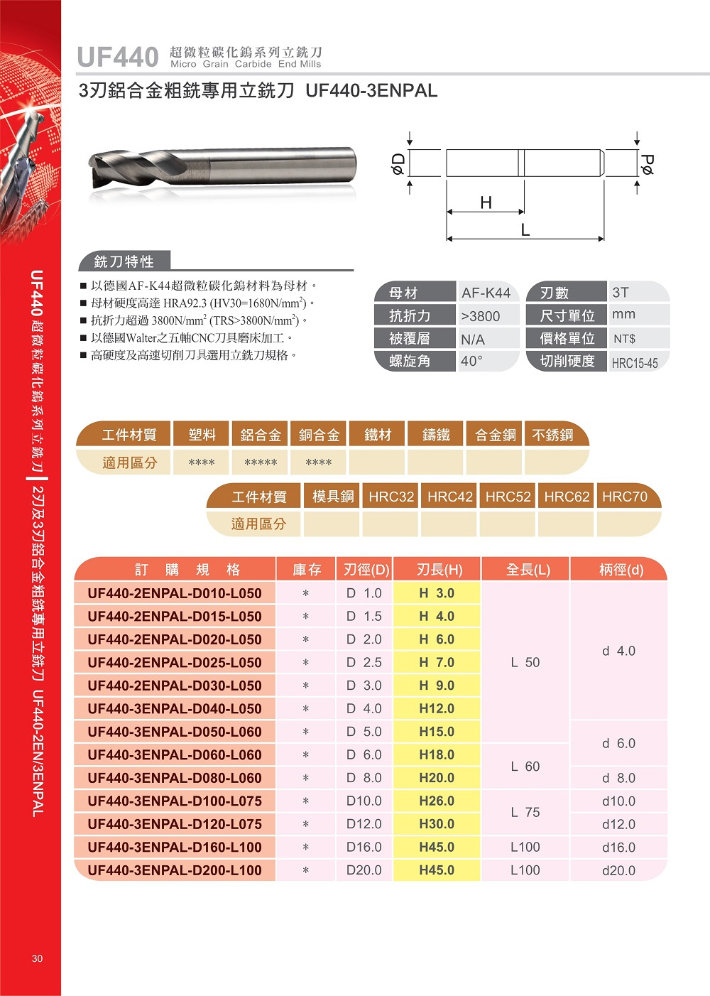 3刃鋁合金粗、精專用立銑刀 UF440-3ENFAL