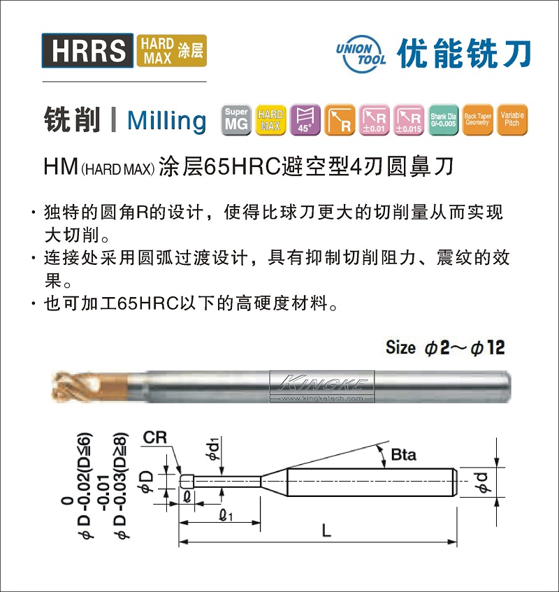 HRRS HM涂層HRC65避空型4刃圓鼻刀